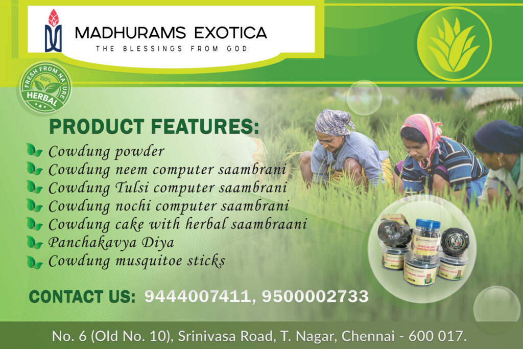 Madhurams exotica Meaning (Good & Sweet + concentration) Madhu Sukumaran S journey began at PSNA Emphatic Fine Arts. Later Madhuram Exotica was founded out of his passion for spirituality. she has always been consistent and true to his content related to spirituality, health and wellbeing of all, As all the cows in our place are domestic cows, we feed them raw food daily.